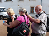 Jatkoimme matkaa Ahvenjärvelle Jaakkimaan ja takaisin Otsoisiin Rytsölänsalmelle, jossa kantaisät ovat asuneet. Saavuttaaksemme salmen, Pekka taituroi bussin kapeaa ja puustoltaan rönsyilevää hiekkatietä pitkin vesistön lähelle ja loppumatka kohti rantaa taittuikin kävellen läpi datsha- alueen.