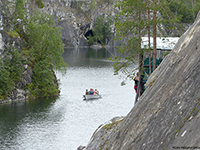 Matkalla pysähdyimme pullakahville Ruskealan Herrankukkaroon, joka on vielä osittain rakenteilla oleva kirkko. Jo neljätoista vuotta kestäneitä rakennustöitä rahoitetaan lahjoituksilla ja kirkon alakerrassa olevan majatalon tuotoin. Nykyinen kirkkosali vihittiin käyttöön vuonna 2010. Kirkkohankeen takana on ollut tohmajärveläinen diakoni Kalevi Keinonen, joka oli ottanut tehtäväkseen rakentaa uuden kirkon vanhan vuonna 1940 palaneen kirkon tilalle. Vanhan kirkon rauniot ovat edelleen uuden kirkon pihapiirissä ja kävimme katsomassa sen sammaloituneita kivijalkoja. Tauon jälkeen jatkoimme matkaa Ruskealan marmorilouhoksille eli niin sanotulle Marmorijärvelle. Ruskealassa louhittiin marmoria jo 1800-luvun loppupuolella ja paikallista marmoria pidettiin suuressa arvossa. Sitä käytettiin Pietarin rakentamisessa ja mm. Iisakin tuomiokirkko on peitetty Ruskealan marmorilla.